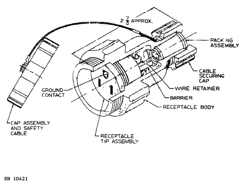 - Safety cable: MS17339-2, looped around neck of receptacle body and crimped to prevent removal.